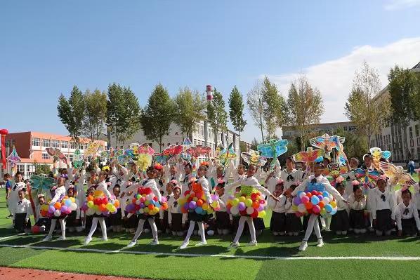 時(shí)代少年課間操,紅白相間是傘舞。紅鼓紅衣有腰鼓,手托蠟燭世間愛。韻律動(dòng)感曳步舞,“繩”彩飛揚(yáng)展陽光。綠茵場(chǎng)地黑白間,小小足球大夢(mèng)想。氣球風(fēng)箏小飛機(jī),追逐夢(mèng)想我先行。
